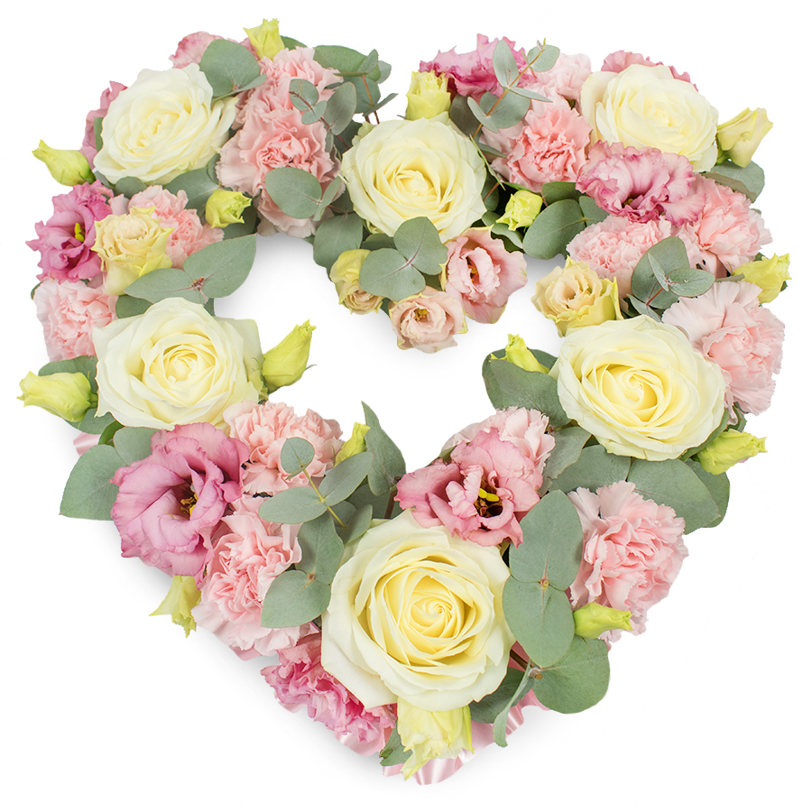 Convey your love and remembrance with our Luminous Open Heart Bouquet, a gracefully arranged tribute designed to honor those dear to your heart. This stunning bouquet features a delicate combination of white roses, pink carnations, pink lisianthus, and eucalyptus leaves, all meticulously hand-selected for their freshness and superior quality.